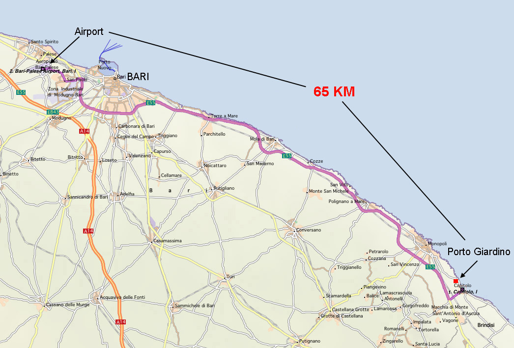 Exit the highway at BARI NORD, then follow Brindisi-Lecce directions. In this way you reach the SS16 (also indicated as E55); see map below.